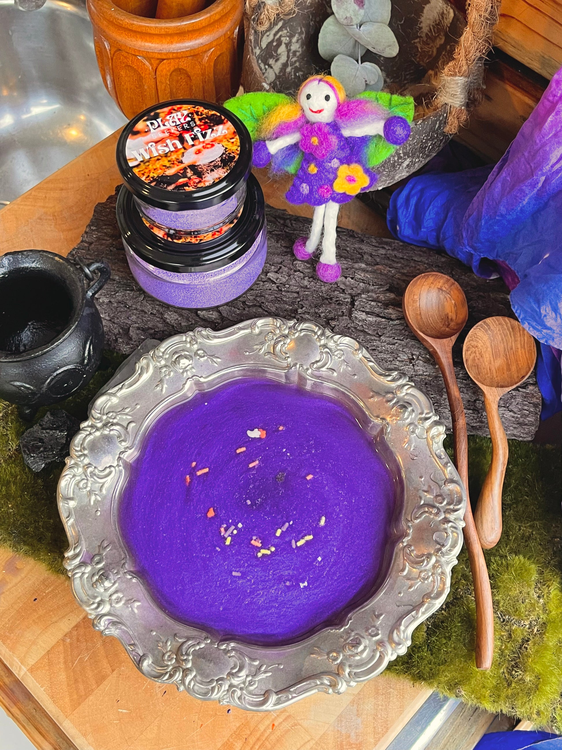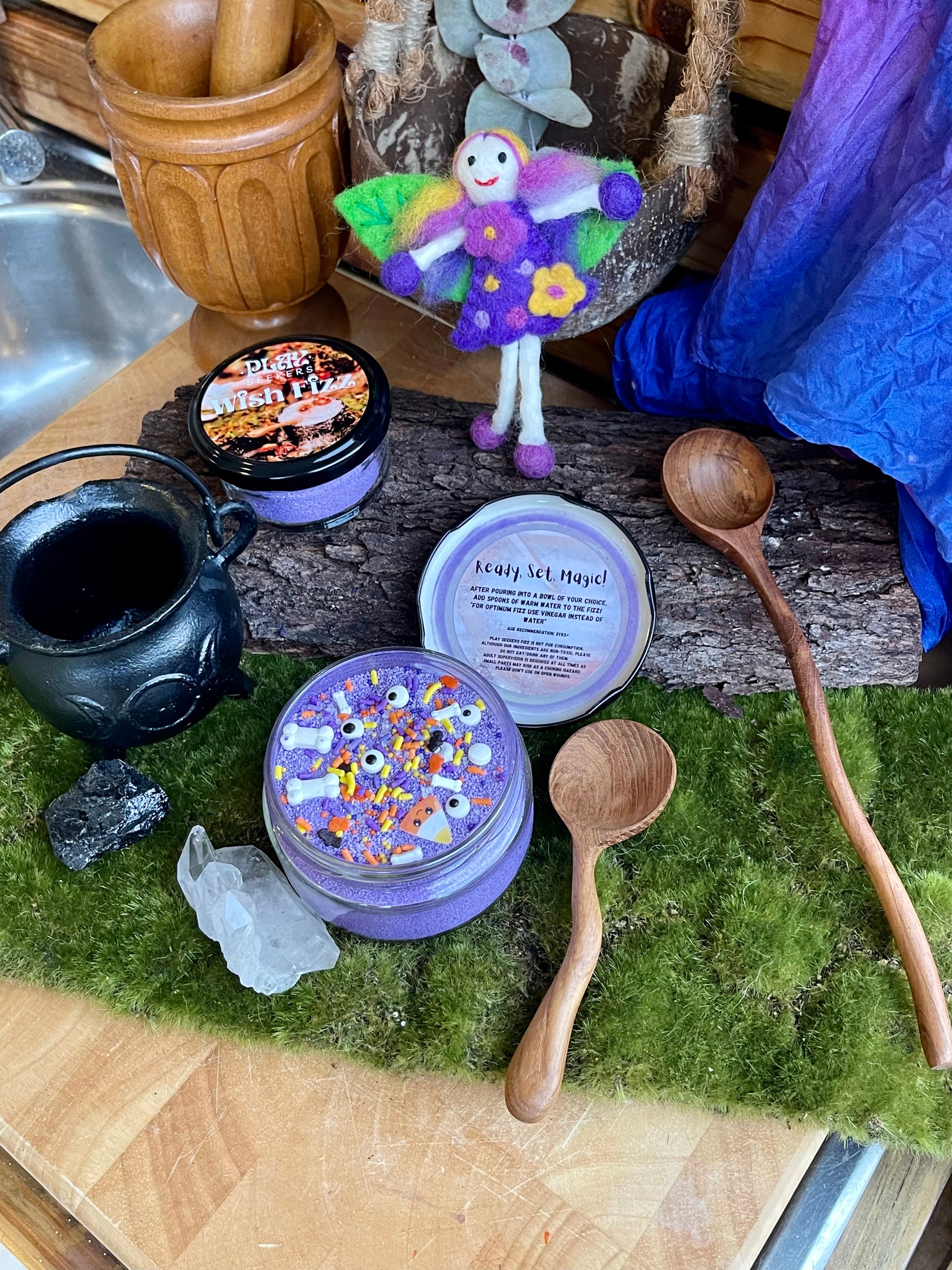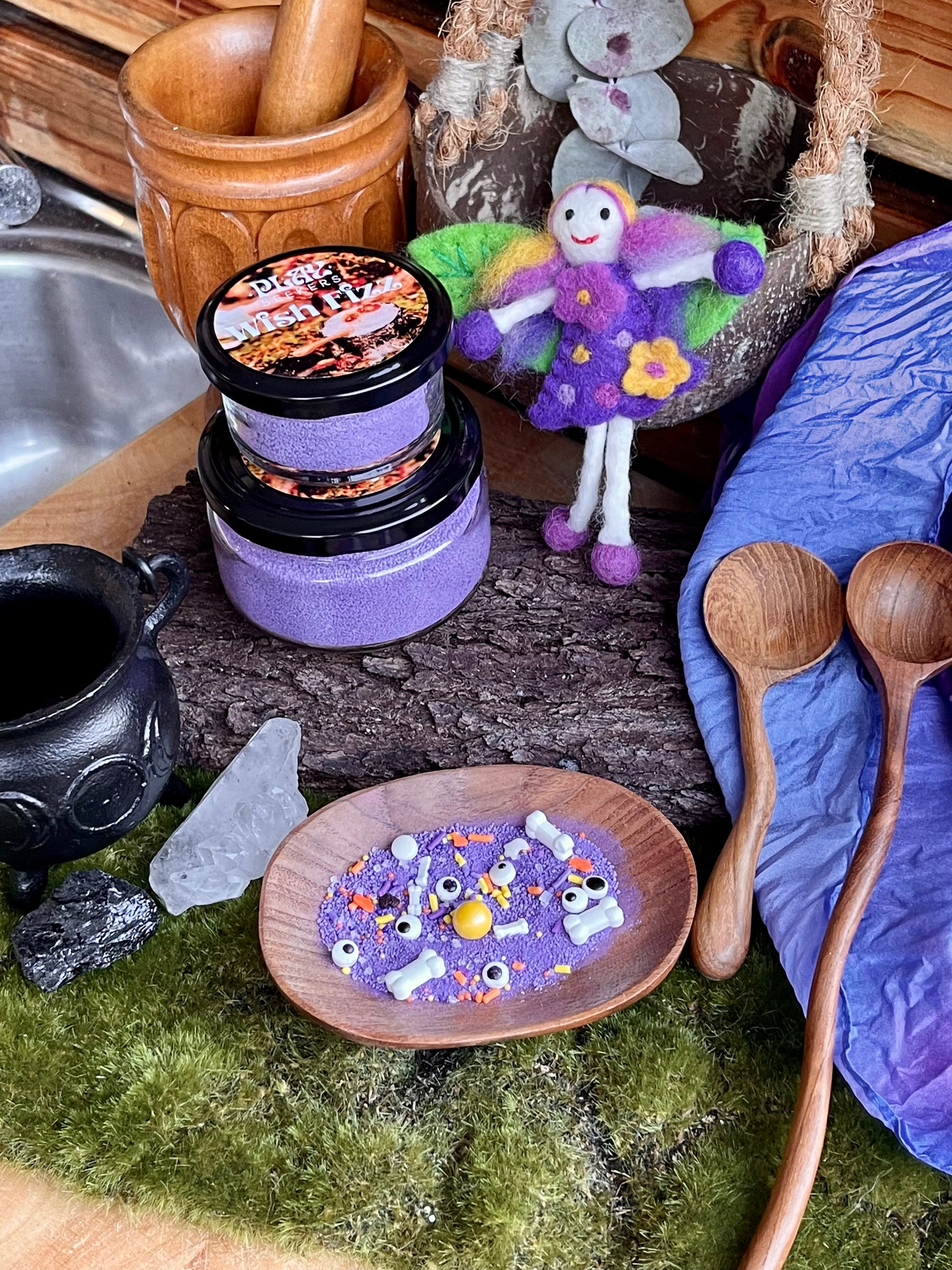 Wish Fizz play inspiration: Children will have a blast pretending they are scientist, fairies, wizard or anything they wish to be! Fizz are a great addition to mud kitchens, water play trays, potion making, science experiments, creating soups or exploring reactions. Create potions to entice fairies and magical creatures to come live within your backyard. Perhaps sprinkle a pinch of Eco glitter, Dried Flowers and crystals to your window frames to help with extra sweet dreams! (we have been told that it also helps the tooth fairy and Santa's elves find your bedrooms easier!