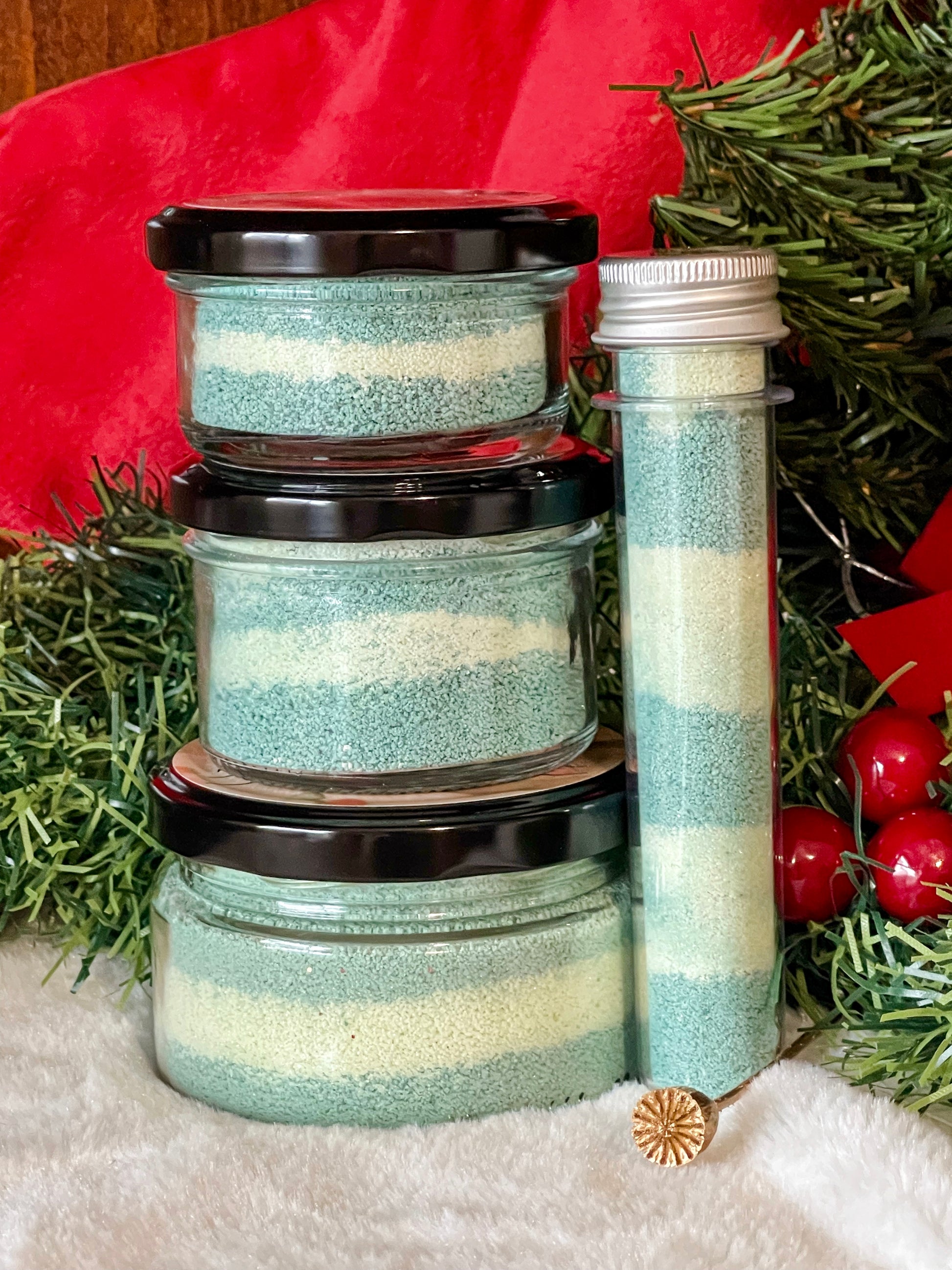 Merry Fizzmas- Feeling Grinchy- Rich Christmas deep Green metallic and vibrant light green colouring. Silver & gold mixed Biodegradable glitter swirls. Each Jar comes labeled with instructions on the inside of the lid.